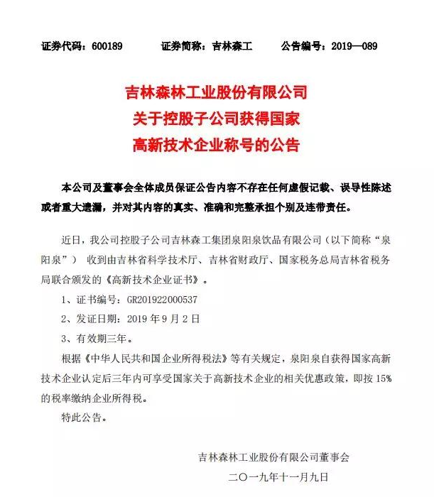 ? ? ? 根據(jù)科學(xué)技術(shù)廳、吉林省財政廳、國家稅務(wù)總局聯(lián)合頒布的《關(guān)于公布吉林省2019年第一批國家高新技術(shù)企業(yè)認(rèn)定結(jié)果的通知》,經(jīng)過層層審核,吉林森工集團泉陽泉飲品有限公司由吉林省科學(xué)技術(shù)廳、吉林省財政廳、北京市國家稅務(wù)局、國家稅務(wù)總局吉林省稅務(wù)局局聯(lián)合批準(zhǔn)下發(fā)的高新技術(shù)企業(yè)認(rèn)定。